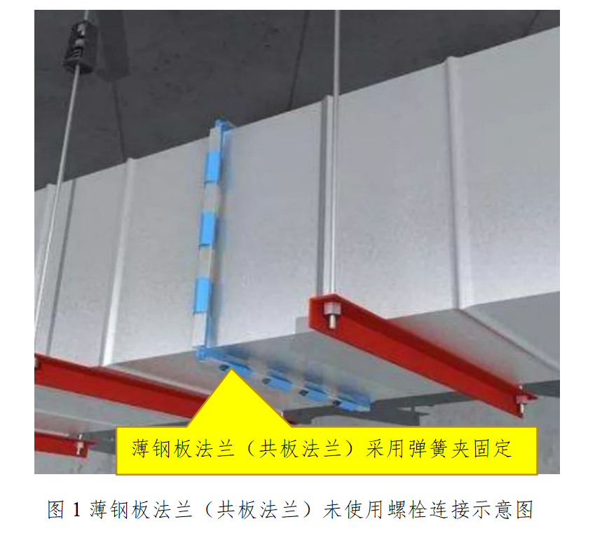 1)错误做法:下图中排烟风管采用薄钢板法兰(共板法兰),但未使用螺栓连接,见图1。