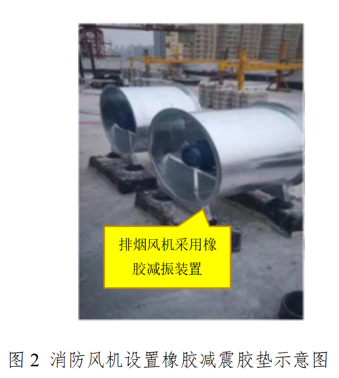 2)错误做法:下图消防专用排烟风机设置了减振装置,不满足规范要求,见图2。