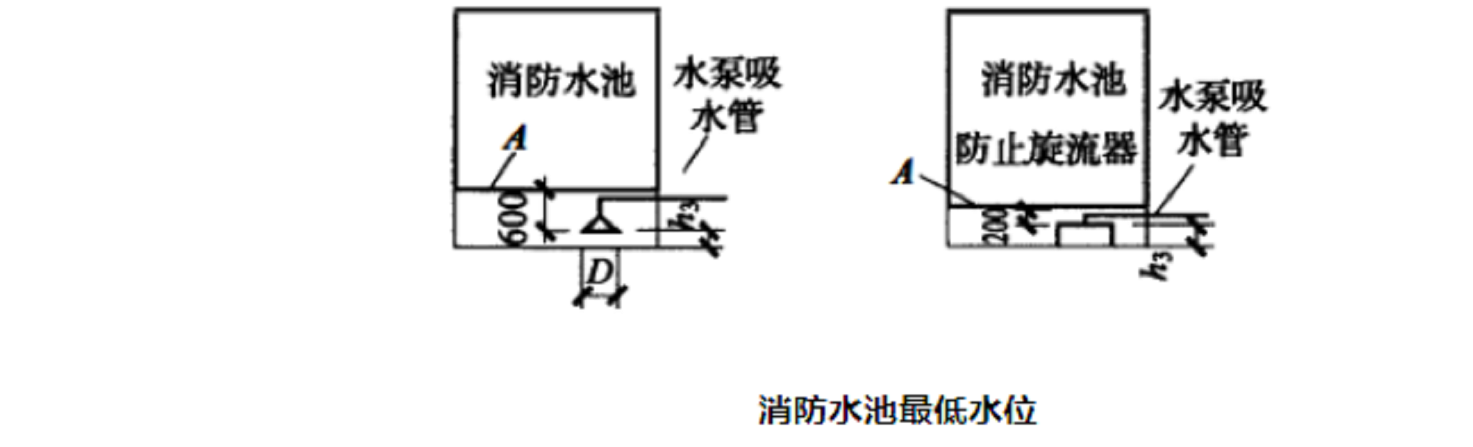 A——消防水池最低水位线;D——吸水管喇叭口直径;h3——喇叭口底至池底的距离(或防止旋流器高度)