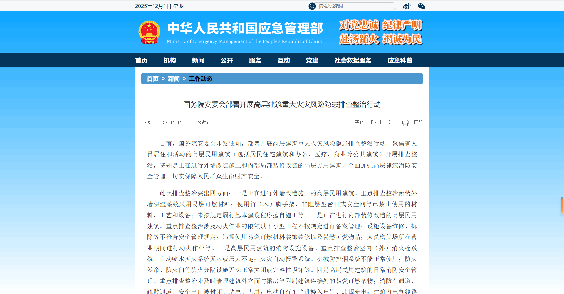 日前,国务院安委会印发通知,部署开展高层建筑重大火灾风险隐患排查整治行动,聚焦有人员居住和活动的高层民用建筑(包括居民住宅建筑和办公、医疗、商业等公共建筑)开展排查整治,特别是正在进行外墙改造施工和内部局部装修改造的高层民用建筑,全面加强高层建筑消防安全管理,切实保障人民群众生命财产安全。