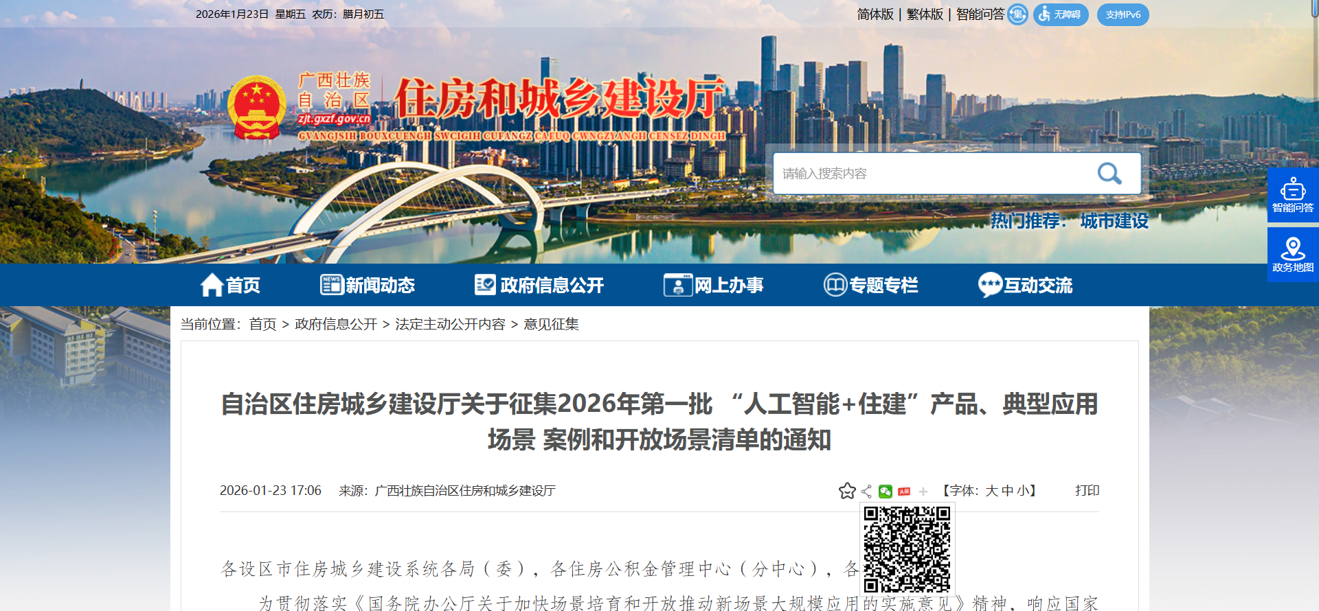 为贯彻落实《国务院办公厅关于加快场景培育和开放推动新场景大规模应用的实施意见》精神,响应国家及自治区关于开展“人工智能+”行动的决策部署,深入挖掘、展示全区住房城乡建设领域人工智能创新应用成果,加快场景培育和开放住房城乡建设领域人工智能应用场景,推动新场景大规模应用,促进人工智能赋能广西住房城乡建设领域高质量发展,现组织开展2026年第一批“人工智能+住建”产品、典型应用场景案例和开放场景清单征集工作,遴选和发布一批创新成果,并推动报送自治区人工智能开放场景库。现将有关事项通知如下: