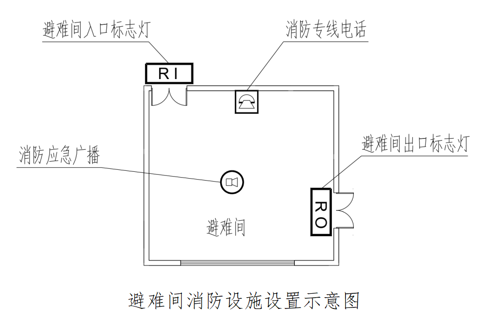 高层病房楼的避难间应设置消防专线电话和消防应急广播,避难间的入口处应设置明显的指示标志,避难间消防设施设置见下图。